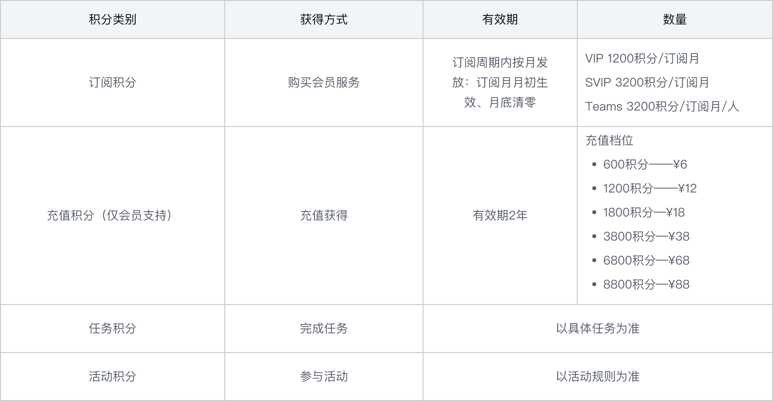 - 会员到期后你的订阅积分将失效,若你重新订阅,将在新订阅周期月初获得订阅积分。你账户中的活动积分与充值积分可以继续使用。