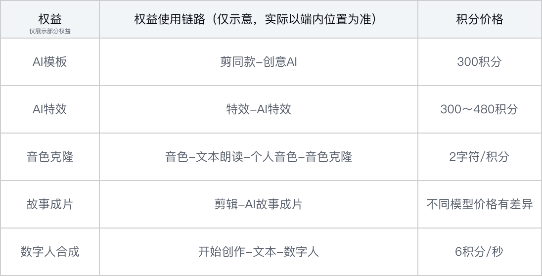 - 为了进一步提升你的使用体验,平台会对账户中的已有资产做升级,账户中原有的每日打卡的积分以及剪辑豆均会转换成适用范围更广的积分,可用于付费权益以及兑换更多福利。可使用的付费权益与可兑换的福利见积分中心。